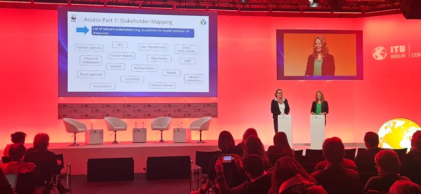 Wie können Tourismusunternehmen ihren Klima-Fußabdruck wirksam reduzieren? Ein zentraler Hebel liegt in der klimafreundlichen Produktgestaltung. Am ITB-Dienstag stellte Swantje Lehners (Futouris e.V.) gemeinsam mit Ulf Sonntag (NIT Institut für Tourismus- und Bäderforschung in Nordeuropa GmbH) und Saskia Sánchez Buitrago (KlimaLink e.V.) zentrale Ergebnisse und Tools aus den Projekten Klimabewusst Reisen und Klimafreundliche Produktgestaltung vor. Die Session lieferte praxisnahe Impulse und nützliche Tipps, wie Tourismusunternehmen ihre Angebote gezielt nachhaltiger gestalten und so ihren Klima-Fußabdruck messbar reduzieren können.