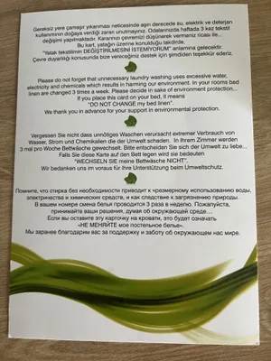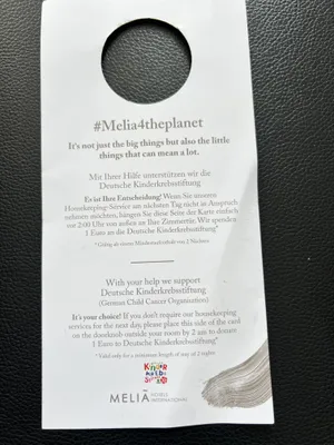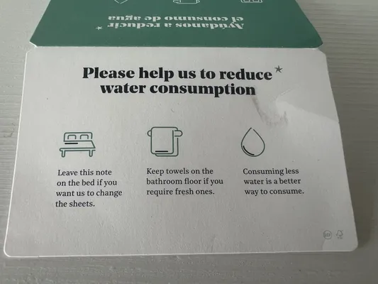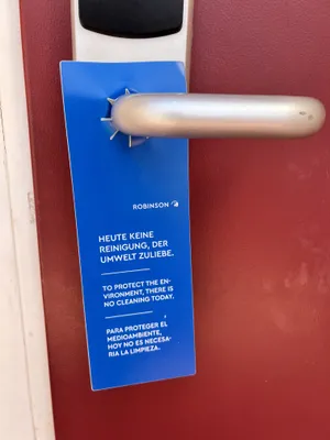 These are great examples of communication and door hangars that guests can leave on their door to convey their environmental preference to the housekeeping team. Not only that, the prevalence of blue door hangars also motivates other guests to consider taking the same steps. The hotel also uses an app for guests that wish to opt-out of cleaning however this does not have the same communications power.